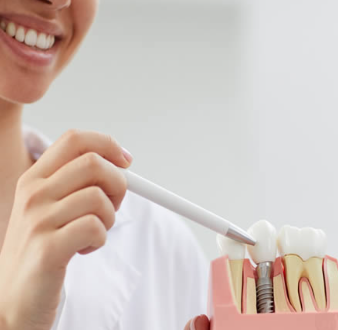 dispositivo de titanio u otro material biocompatible que se coloca quirúrgicamente en el hueso de la mandíbula o el maxilar para reemplazar la raíz de un diente perdido.